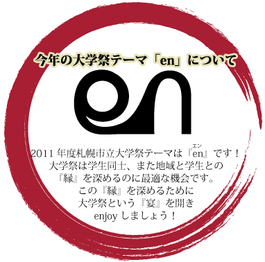 | このサイトは平成23年度札幌市立大学祭公式ホームページです。 大学祭に関しての情報を発信していく予定です。 |
